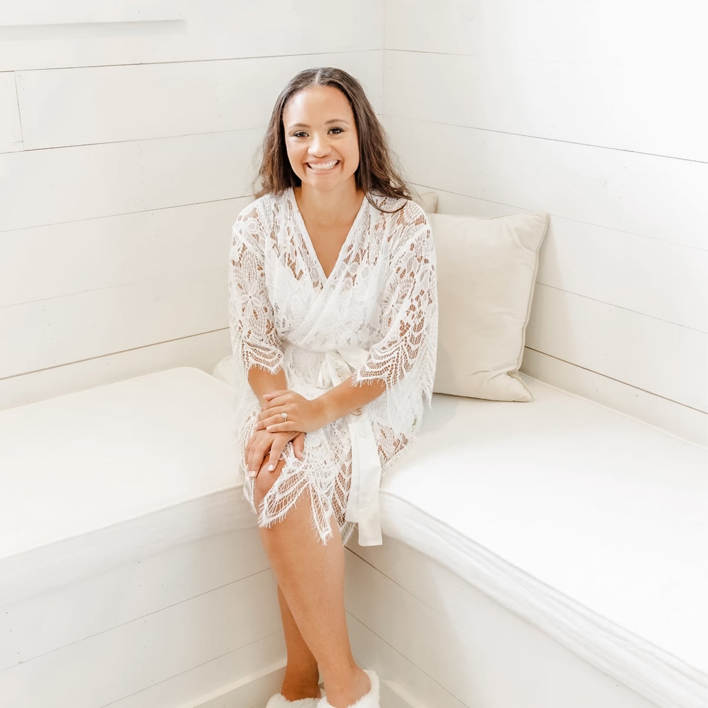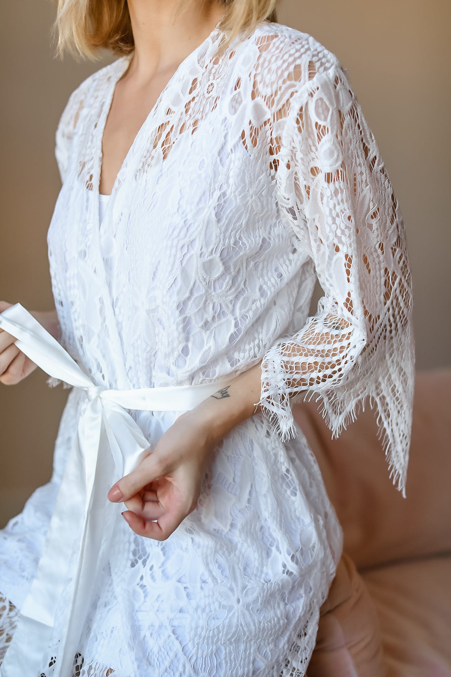 Make your wedding morning unforgettable with our elegant lace bridal robe, exclusively at Blossom & Syrup. Designed with delicate scalloped lace, sheer ¾ sleeves, and a matching slip for comfortable coverage, this robe is the ultimate blend of romance and sophistication. Perfect for the bride’s getting-ready moments, pre-wedding photos, or honeymoon mornings, it’s a timeless piece that transitions beautifully from bridal suite to beyond. Whether you’re treating yourself or gifting the bride-to-be, this knee length lace robe creates an effortlessly elegant look she’ll cherish forever. Personalize the belt with titles for a one-of-a-kind keepsake that captures the magic of her special day.